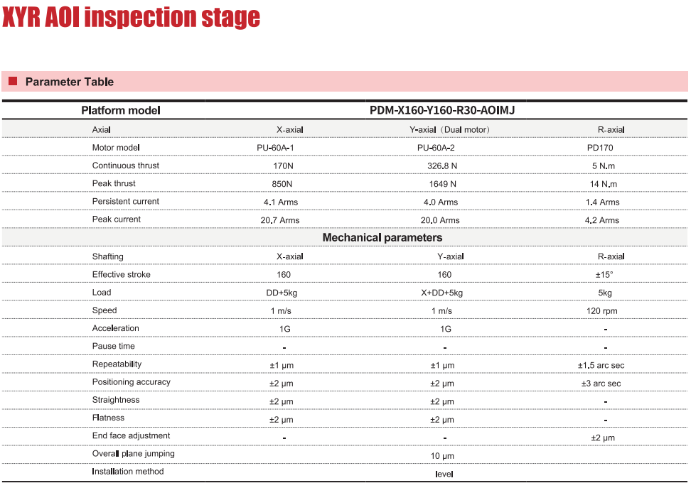XYR 중첩 구조, 철심이 없는 리니어 모터의 직접 구동 제어, 코깅 효과 없음, 저속(작은 속도 변동)에서 부드러운 작동, DD 단면 런아웃은 2um 미만, 조립 후 플랫폼의 전체 평면 런아웃은 10um 미만, 전체 스트로크의 반복성은 ±1um 미만, 위치 정확도는 ±2um 미만입니다. 주로 자동차 전자, 디스플레이 테스트(디지털 튜브, LCD 화면, LED 디스플레이), 의약, 식품, 정밀 부품 가공 및 제품을 해당 위치로 실행한 후 측정, 계수, 감지 및 지능형 판단의 목적에 사용됩니다.