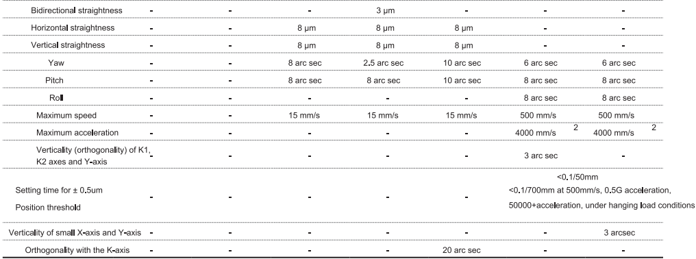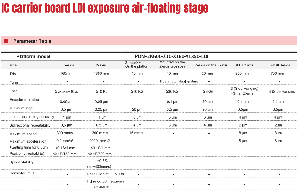 공기 부양 XY 중첩 구조, 빔 측면 조립 K축 및 Z축(기계식 가이드 레일), 코어리니어 모터 직접 구동 제어, 코깅 효과 없음을 채택한 다축 에어플로팅 플랫폼은 저속에서 원활하게 작동할 수 있습니다(속도 변동이 작음), 매우 우수한 동적 성능, 위치 정확도 및 반복 가능한 위치 정확도로 비접촉식 고정밀 격자 눈금자를 장착한 다축 공기 에어플로팅 플랫폼은 고정밀 격자 위치 피드백, 0.5um 미만의 전체 스트로크 반복성, 1um 미만의 위치 정확도 및 기타 구조적 특성을 제공니다. 주로 반도체 생산 라인, 마이크로일렉트로닉스 생산, LCD 디스플레이, 삭제, PCB 제품 및 기타 고정밀 및 고효율이 요구되는 산업 프로젝트에 사용됩니다.